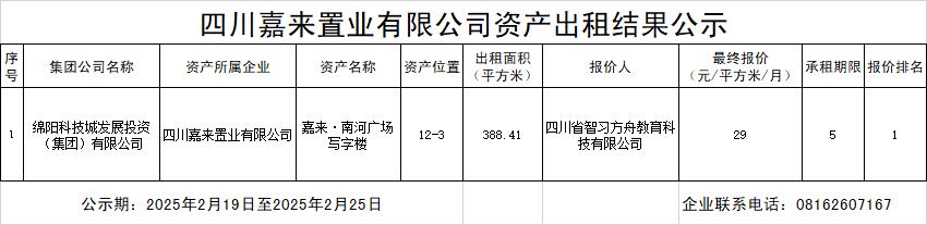 四川嘉来置业有限公司资产出租结果公示