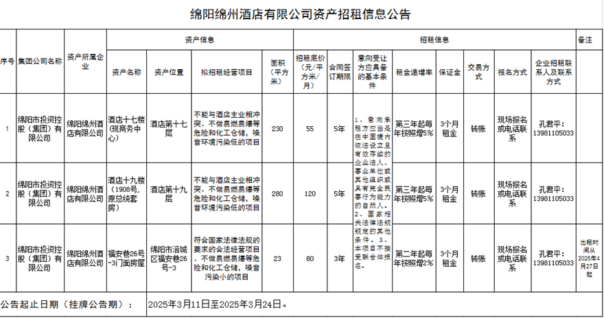 绵阳绵州酒店有限公司资产招租信息公告
