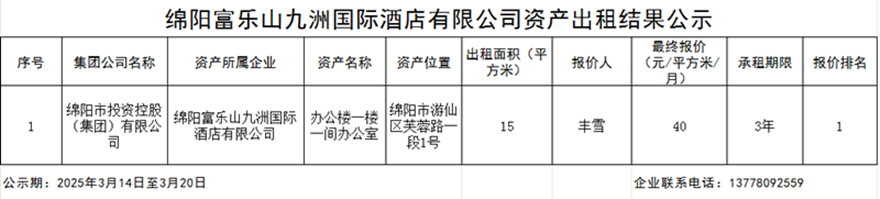 绵阳富乐山九洲国际酒店有限公司资产出租结果公示