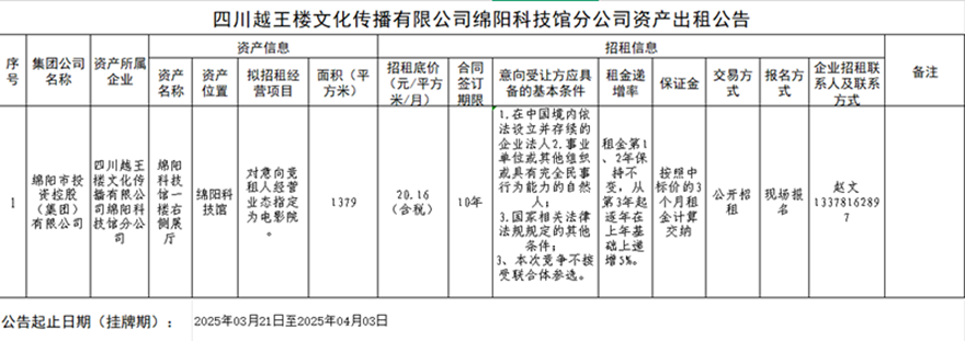 四川越王楼文化传播有限公司绵阳科技馆分公司资产出租公告