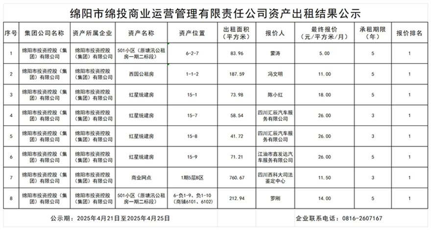 绵阳市best365足球官网商业运营管理有限责任公司资产出租结果公示
