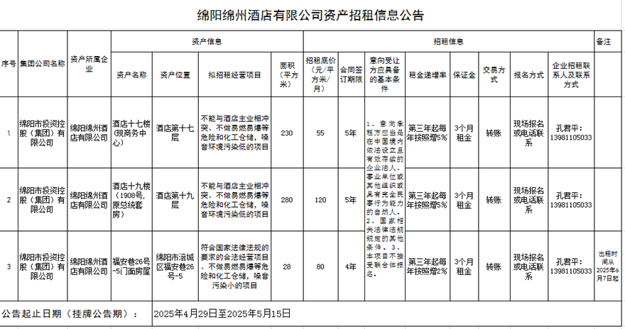 绵阳绵州酒店有限公司资产招租信息公告