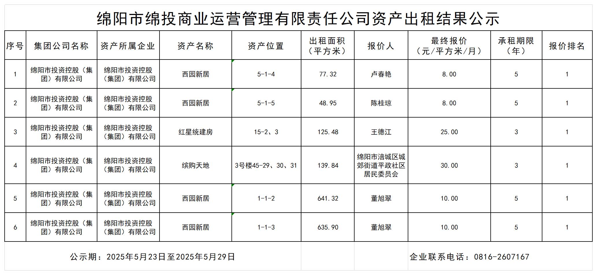 绵阳市best365足球官网商业运营管理有限责任公司资产出租结果公示