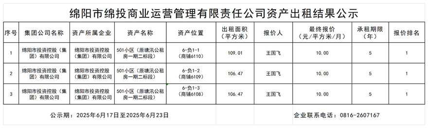绵阳市best365足球官网商业运营管理有限责任公司资产出租结果公示