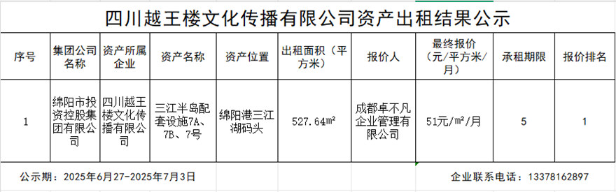 四川越王楼文化传播有限公司资产出租结果公示