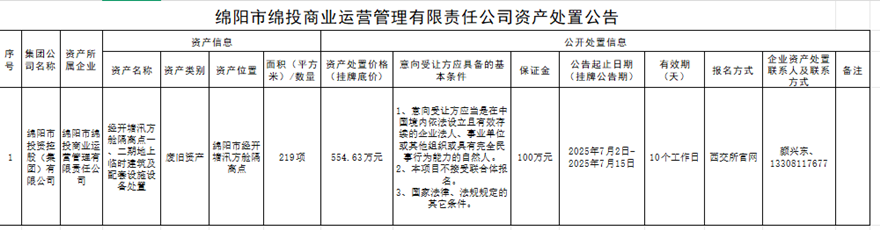 绵阳市best365足球官网商业运营管理有限责任公司资产处置公告