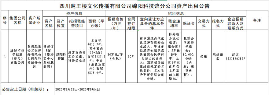 四川越王楼文化传播有限公司绵阳科技城分公司资产出租公告