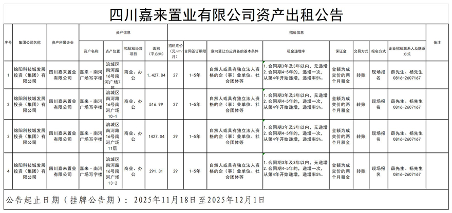 四川嘉来置业有限公司资产出租公告