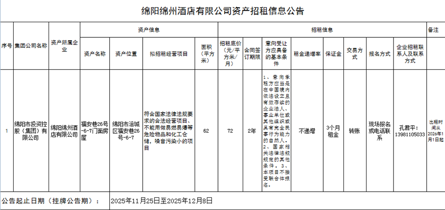 绵阳绵州酒店有限公司资产招租信息公告