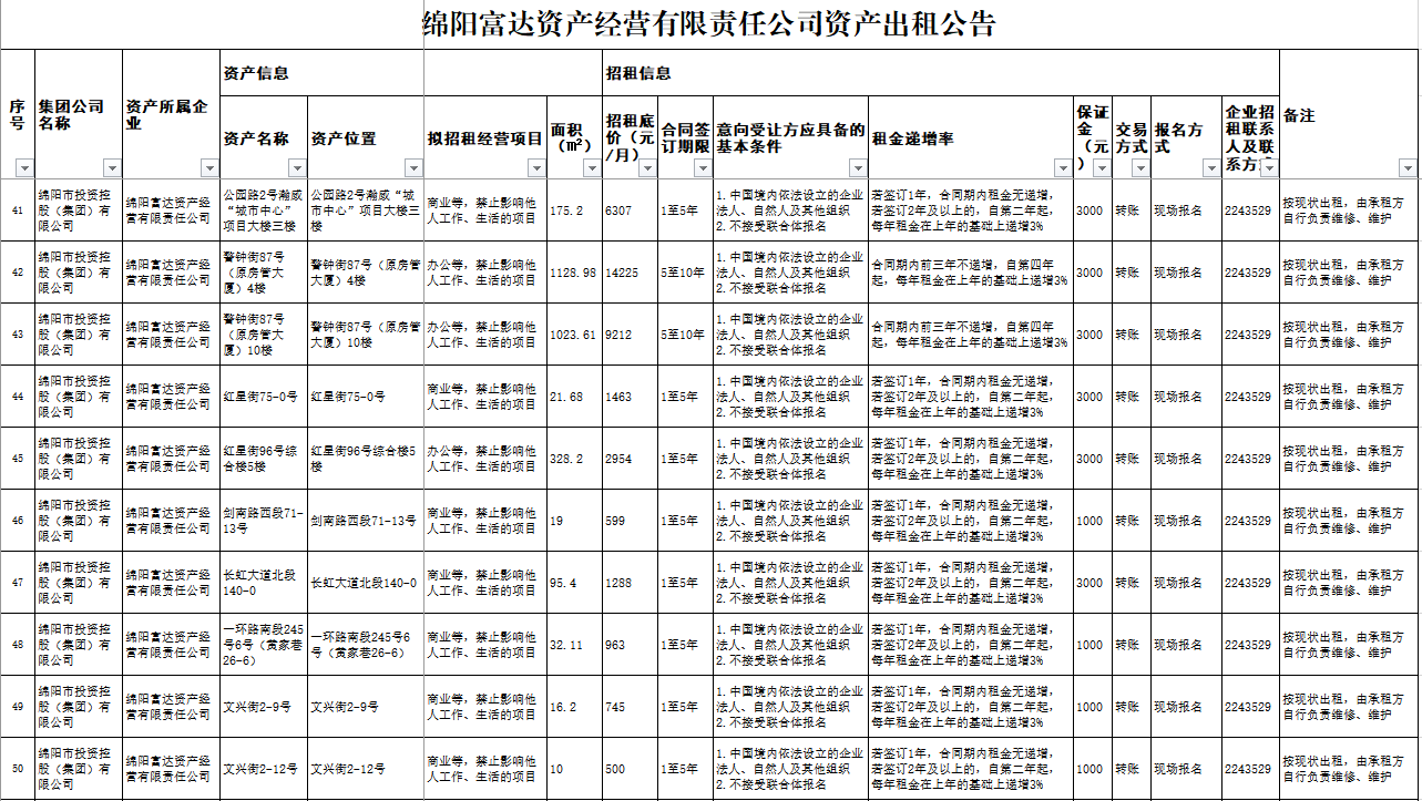 绵阳富达资产经营有限责任公司资产出租公告