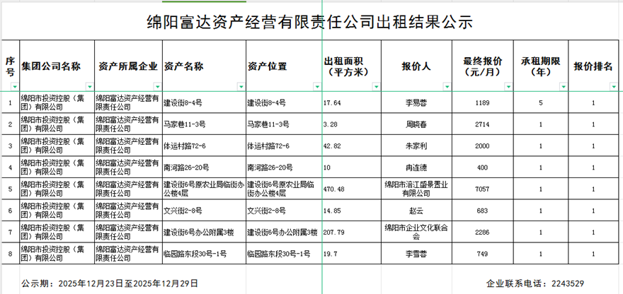 绵阳富达资产经营有限责任公司出租结果公示