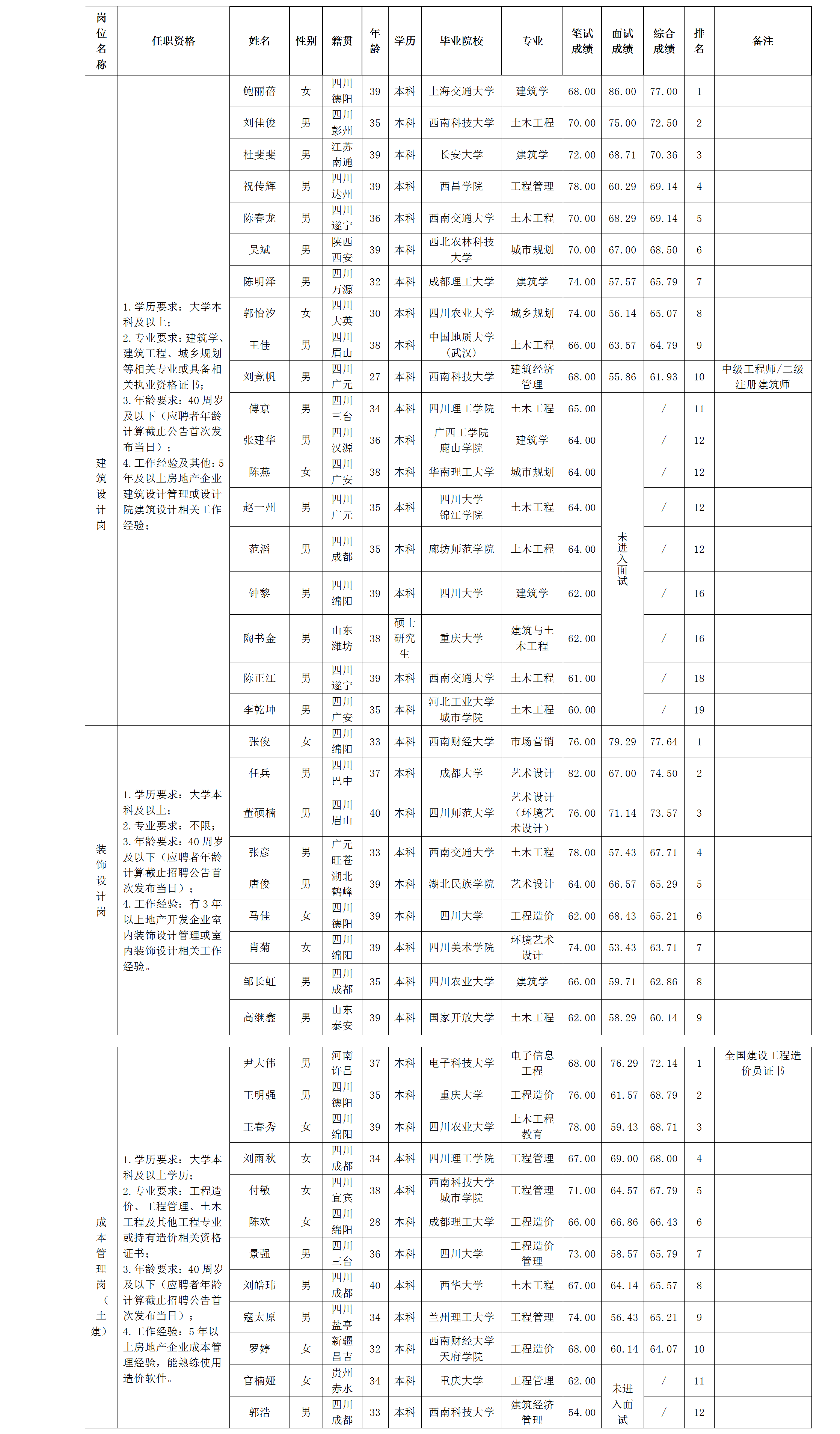 根据绵阳市best365足球官网置地有限公司发布的招聘公告及招聘相关规定,经笔试、面试等程序,现将笔试、面试成绩予以公示。