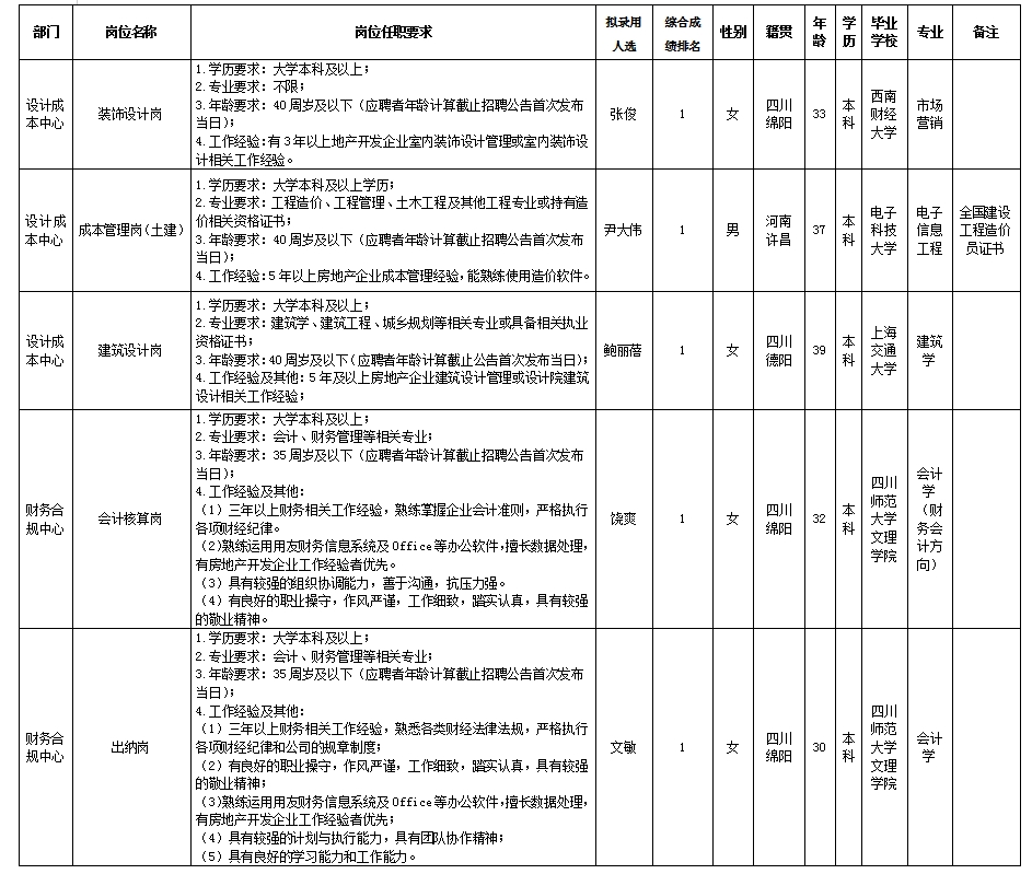 根据绵阳市best365足球官网置地有限公司发布的招聘公告及招聘相关规定,经笔试、面试、考察、体检等程序,拟录用张俊等5名同志到绵阳市best365足球官网置地有限公司工作,现予以公示,具体情况如下: