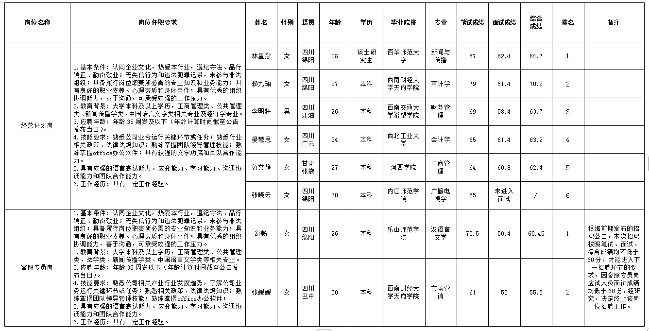 根据绵阳市城市停车管理有限公司发布的招聘公告及招聘相关规定,经笔试、面试等程序,现将笔试(面试)成绩予以公示。