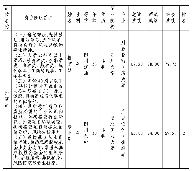 根据绵阳best365足球官网私募基金管理有限公司发布的招聘公告及招聘相关规定,经笔试、面试等程序,现将内部选聘成绩予以公示。