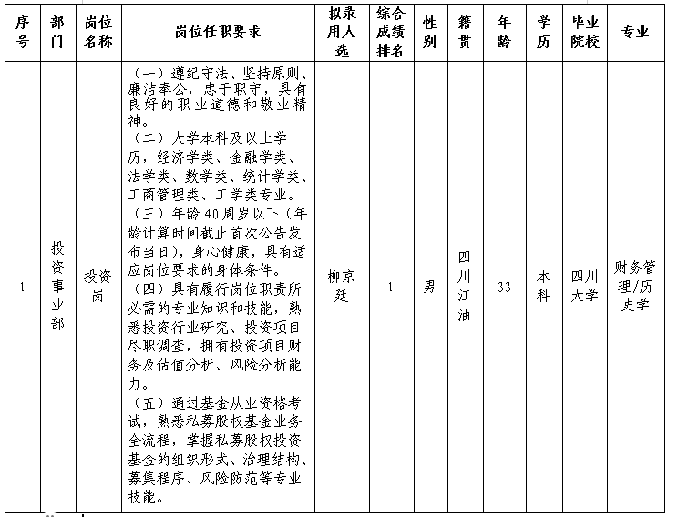 根据绵阳best365足球官网私募基金管理有限公司发布的招聘公告及招聘相关规定,经笔试、面试、背调等程序,拟录用柳京廷同志到绵阳best365足球官网私募基金管理有限公司工作,现予以公示,具体情况如下: