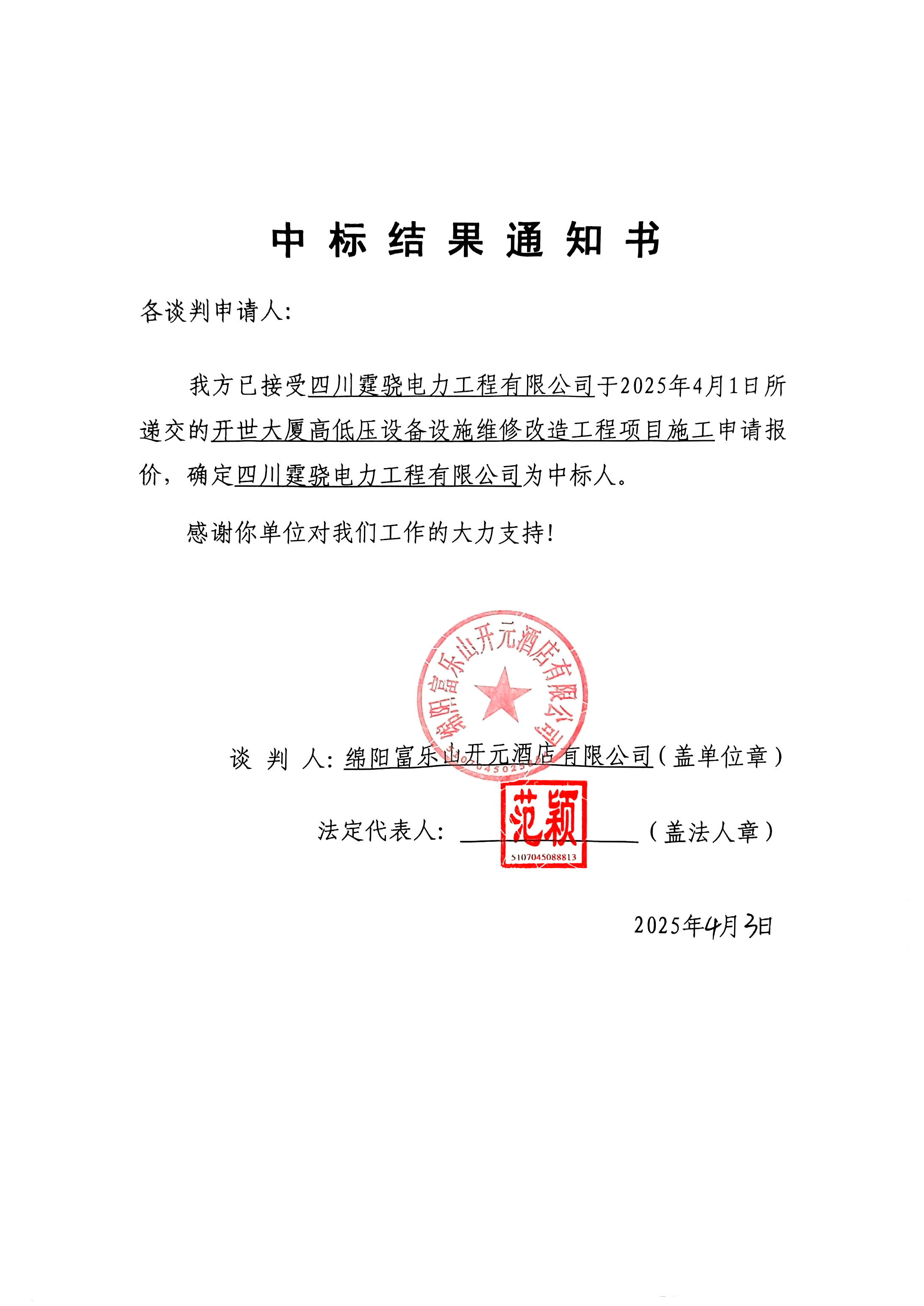 开世大厦高低压设备设施维修改造工程项目施工竞争性谈判结果公告