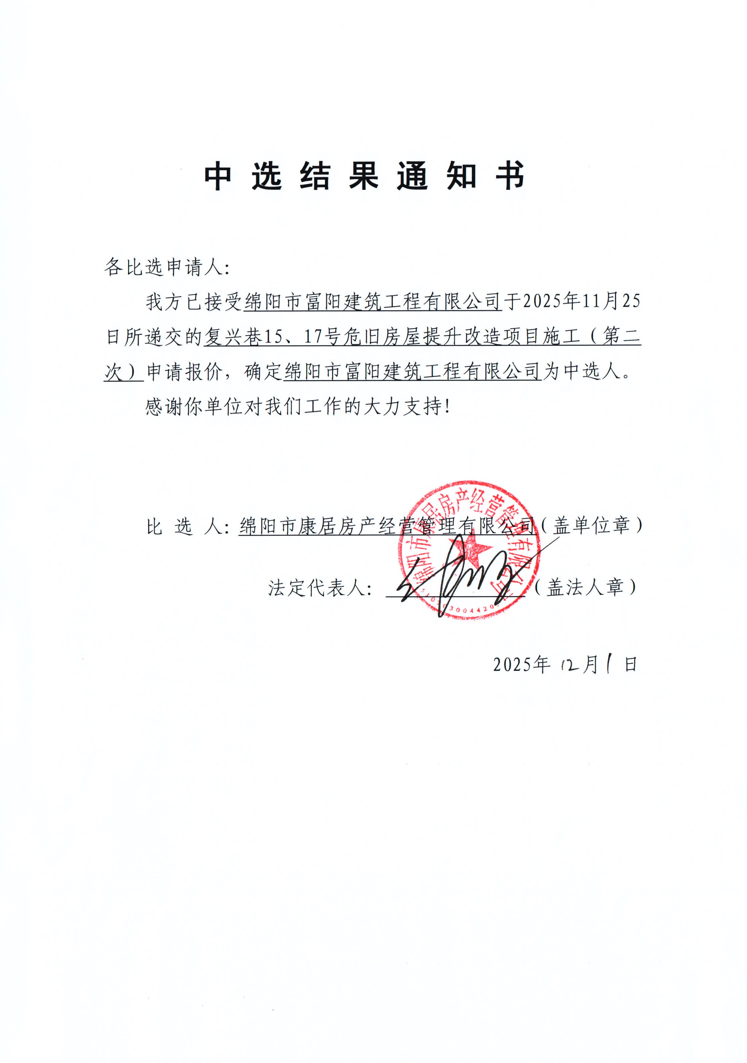 复兴巷15、17号危旧房屋提升改造项目施工(第二次)中选结果通知